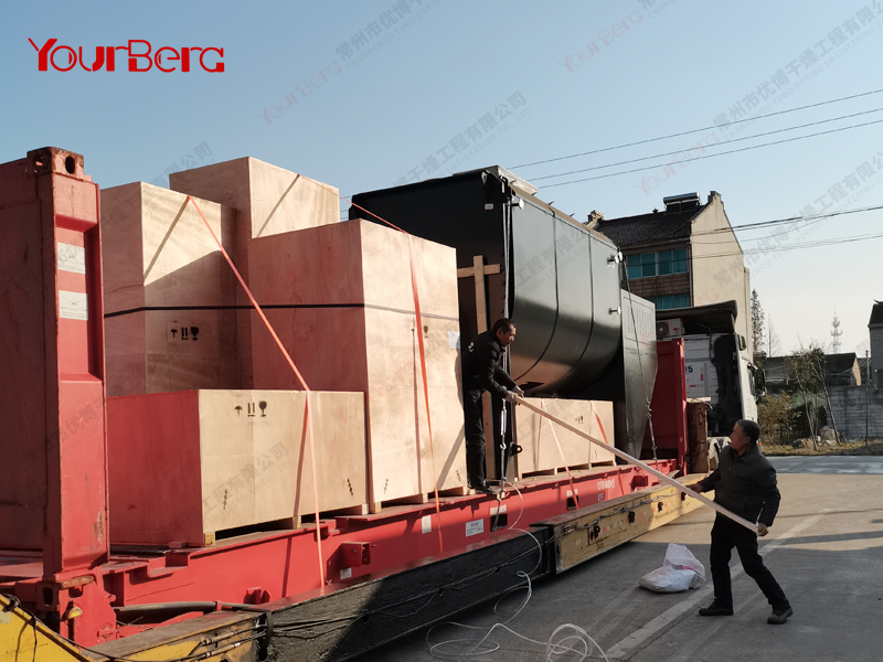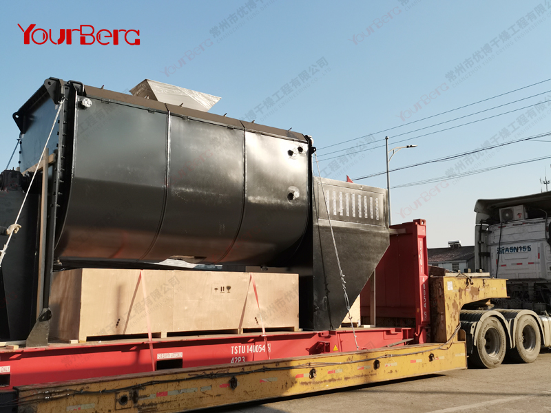 空心軸上密集排列著楔型中空漿葉,熱介質經空心軸流經漿葉。單位有效容積內傳熱面積很大,熱介質溫度從-40℃到320℃,可以是水蒸汽,也可以是液體型:如熱水、導熱油等。間接傳導加熱,沒有攜帶空氣帶走熱量,熱量均用來加熱物料。熱量損失僅為通過器體保溫層向環境的散熱。楔型漿葉傳熱面具有自清潔功能。物料顆粒與楔型面的相對運動產生洗刷作用,能夠洗刷掉楔型面上附著物料,使運轉中一直保持著清潔的傳熱面。漿葉干燥機的殼體為Ω型,殼體內一般安排二到四根空心攪拌軸。殼體有密封端蓋與上蓋,防止物料粉塵外泄而充分發揮作用。