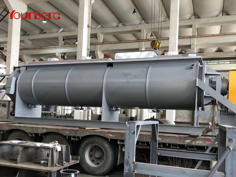 空心軸上密集排列著楔型中空漿葉,熱介質(zhì)經(jīng)空心軸流經(jīng)漿葉。單位有效容積內(nèi)傳熱面積很大,熱介質(zhì)溫度從-40℃到320℃,可以是水蒸汽,也可以是液體型:如熱水、導(dǎo)熱油等。間接傳導(dǎo)加熱,沒有攜帶空氣帶走熱量,熱量均用來加熱物料。熱量損失僅為通過器體保溫層向環(huán)境的散熱。楔型漿葉傳熱面具有自清潔功能。物料顆粒與楔型面的相對運動產(chǎn)生洗刷作用,能夠洗刷掉楔型面上附著物料,使運轉(zhuǎn)中一直保持著清潔的傳熱面。漿葉干燥機(jī)的殼體為Ω型,殼體內(nèi)一般安排二到四根空心攪拌軸。殼體有密封端蓋與上蓋,防止物料粉塵外泄而充分發(fā)揮作用。