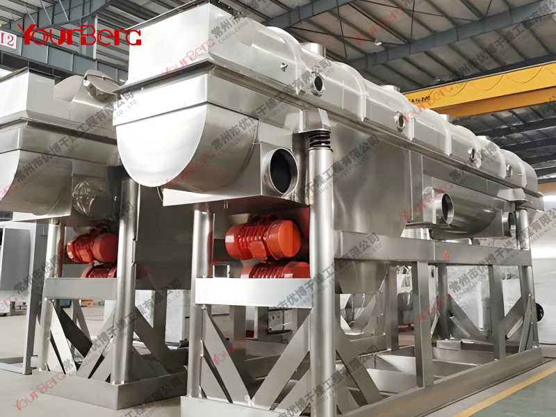 普通流化床干燥機在干燥顆粒物料時,可能會存在下述問題:(1)當顆粒粒度較小時形成溝流或死區;(2)顆粒分布范圍大時夾帶會相當嚴重;(3)由于顆粒的返混,物料在機內滯留時間不同,干燥后的顆粒含濕量不均;(4)物料濕度稍大時會產生團聚和結塊現象,而使流化惡化等。為了克服上述問題,出現了數種改型流化床,其中振動流化床就是一種較為成功的改型流化床干燥機。