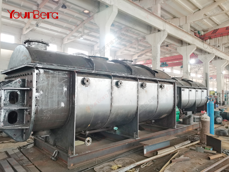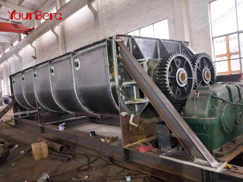 空心軸上密集排列著楔型中空漿葉,熱介質經空心軸流經漿葉。單位有效容積內傳熱面積很大,熱介質溫度從-40℃到320℃,可以是水蒸汽,也可以是液體型:如熱水、導熱油等。間接傳導加熱,沒有攜帶空氣帶走熱量,熱量均用來加熱物料。熱量損失僅為通過器體保溫層向環境的散熱。楔型漿葉傳熱面具有自清潔功能。物料顆粒與楔型面的相對運動產生洗刷作用,能夠洗刷掉楔型面上附著物料,使運轉中一直保持著清潔的傳熱面。漿葉干燥機的殼體為Ω型,殼體內一般安排二到四根空心攪拌軸。殼體有密封端蓋與上蓋,防止物料粉塵外泄而充分發揮作用。