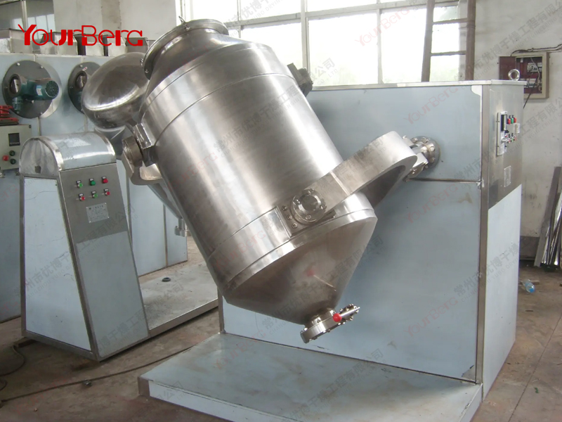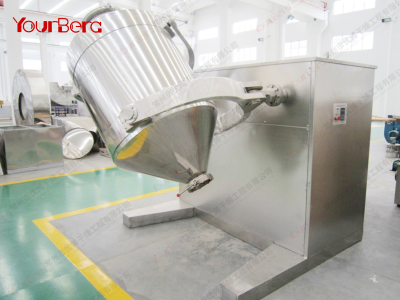 結(jié)構(gòu):該機(jī)由機(jī)座、傳動(dòng)系統(tǒng)、電器控制系統(tǒng)、多向運(yùn)動(dòng)機(jī)構(gòu)、混合筒等部件組成。與物料直接接觸的混合筒采用不銹鋼材料制造,桶體內(nèi)外壁均經(jīng)鏡面拋光。