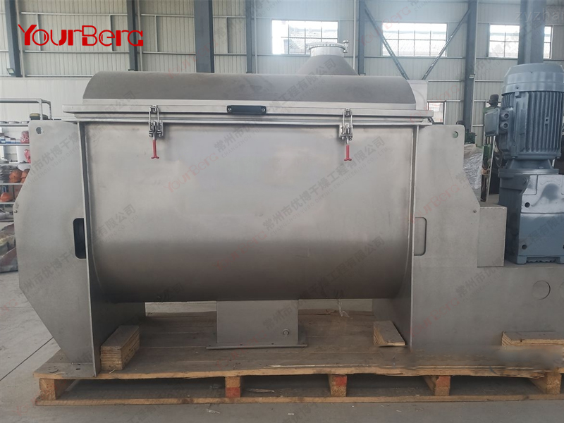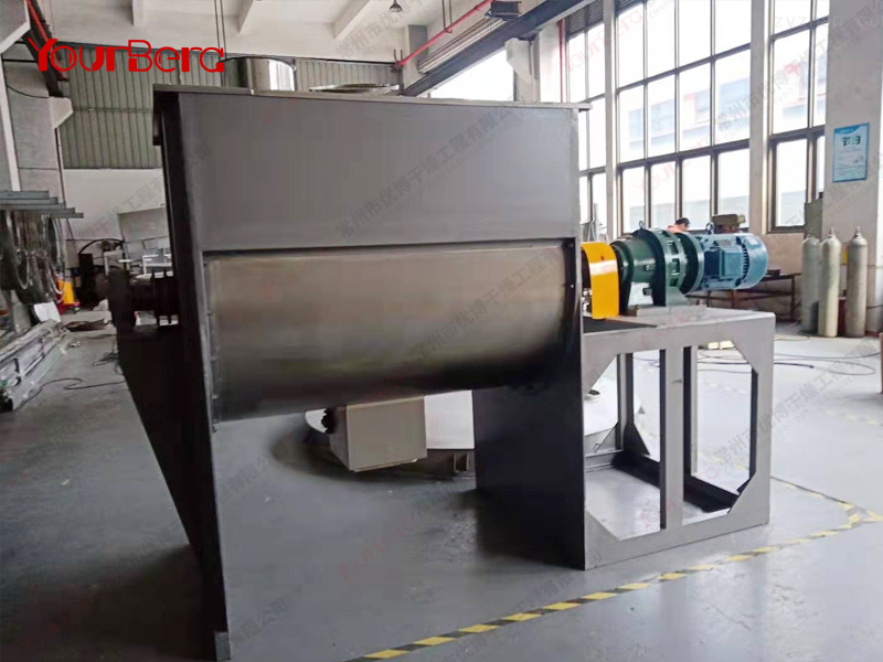 臥式螺帶混合機由安裝于攪拌軸上的內外徑螺旋帶動桶體內物料翻動,使攪拌器在桶體內大范圍翻動物料。攪拌器結構上,螺旋設計成內外、左右互為反螺旋,攪拌器工作時內螺旋帶動靠近軸心處物料做軸心旋轉,軸向由內至兩側推動,外螺旋帶動靠近筒壁物料做軸心旋轉,軸向由兩側至內推動,于是造成物料在筒體內對流循環、剪切滲混,完成物料在較短時間內快速均勻混合。